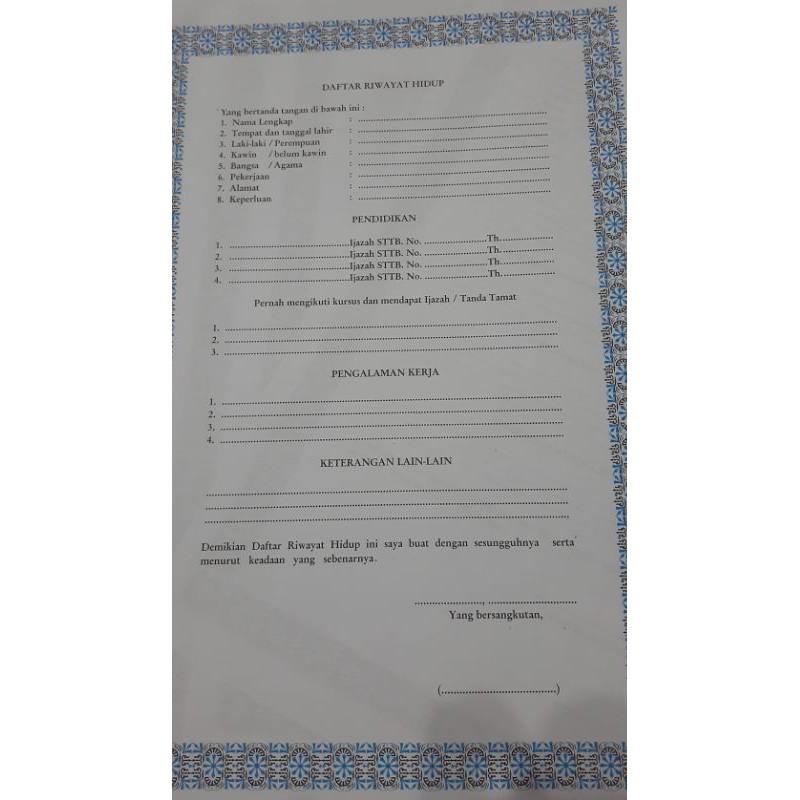 Pakailahkertas kertas folio garis (double folio) contoh kertas daftar riwayat hidup. Daftar riwayat hidup biasanya diketik pada kertas berukuran a4 atau f4 menggunakan ukuran dan jenis huruf yang formal.